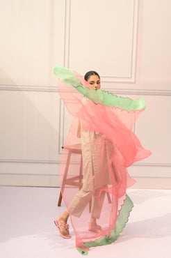 Paired with a pure organza dupatta in a vibrant shade of pink to lift the outfit.